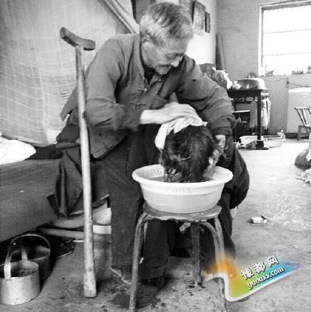 独腿老人给妻子洗头发